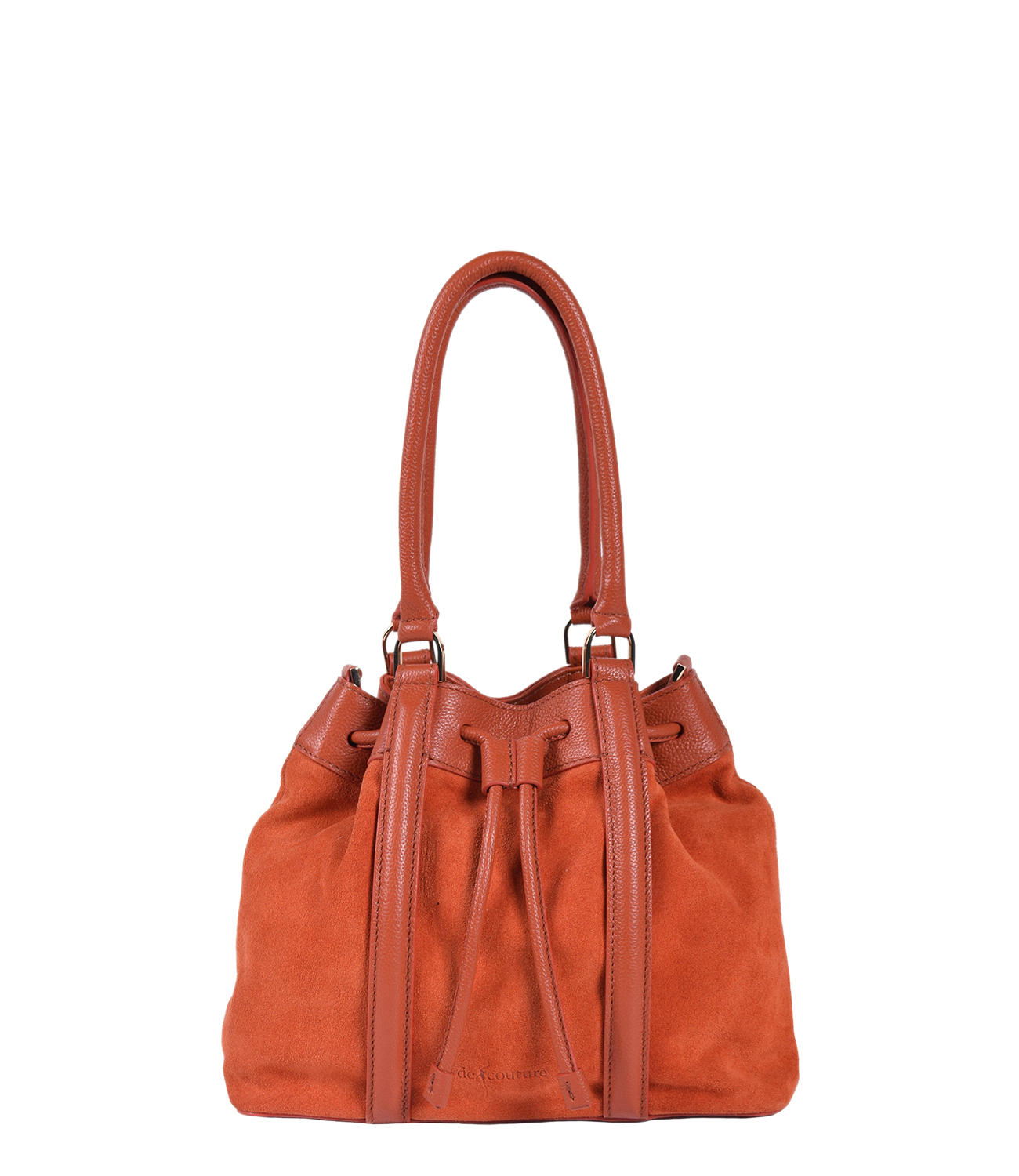 HANDMADE IN ITALY — MICROGRAINED CALF LEATHER AND SUEDE — DRAWSTRING CLOSURE — DOUBLE HANDLES — BUCKET SHAPE