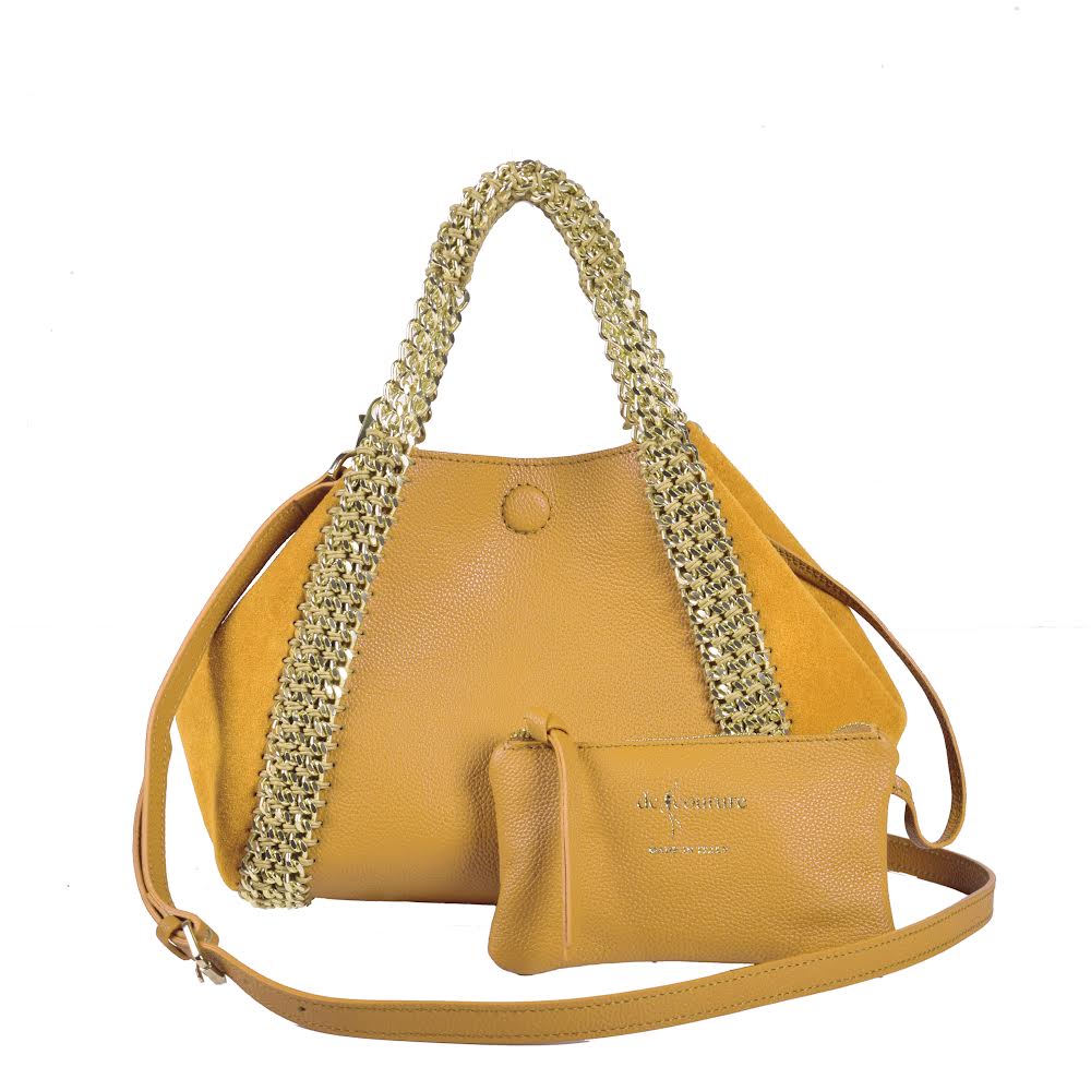 The structured micrograin body ensures durability and a modern finish, while the suede panels add softness and depth. Completed with signature woven chain handles, it is a distinctive piece that balances craftsmanship and contemporary style.