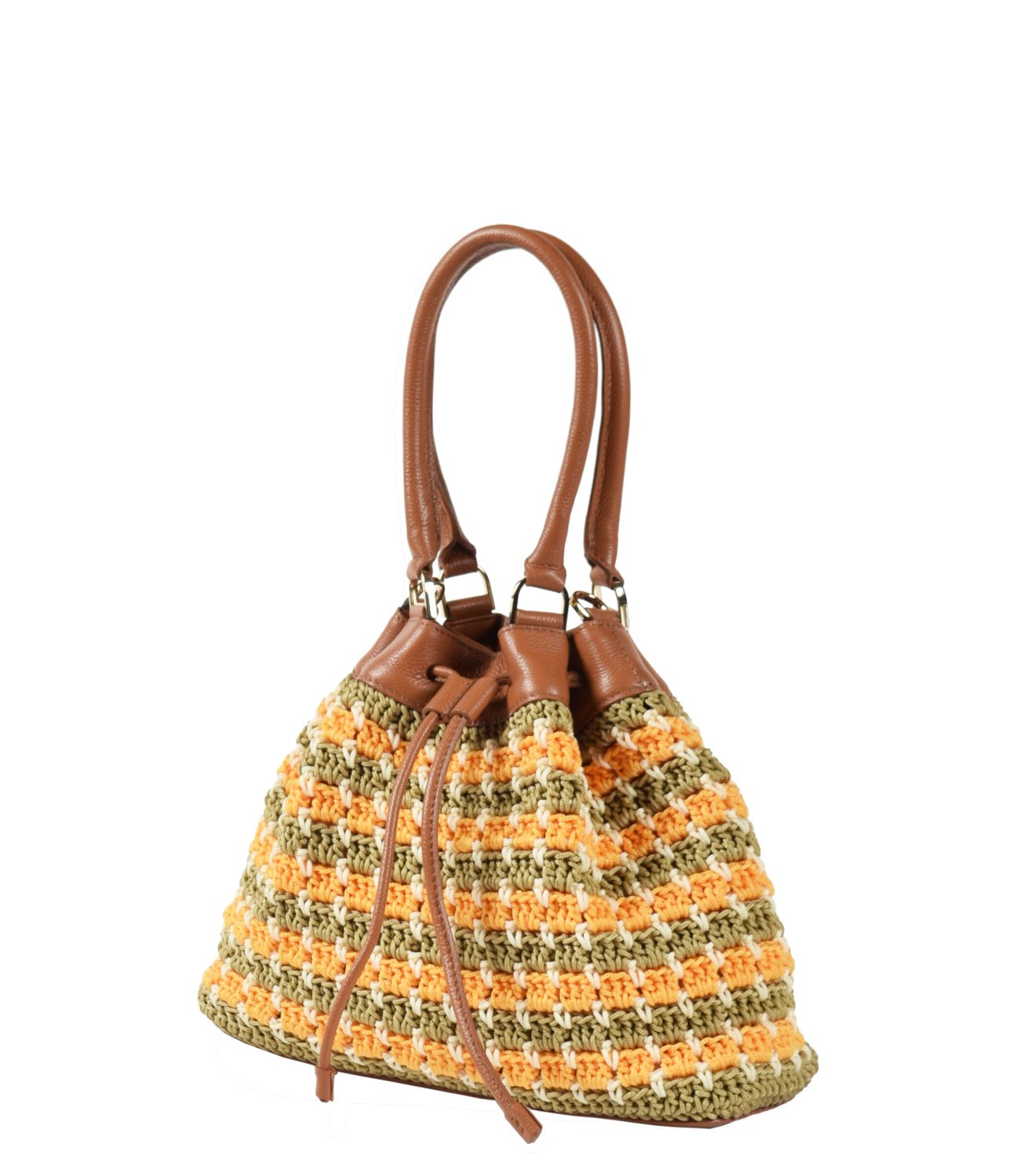 Its drawstring closure and double handles ensure versatility, while the structured base provides stability and timeless sophistication.