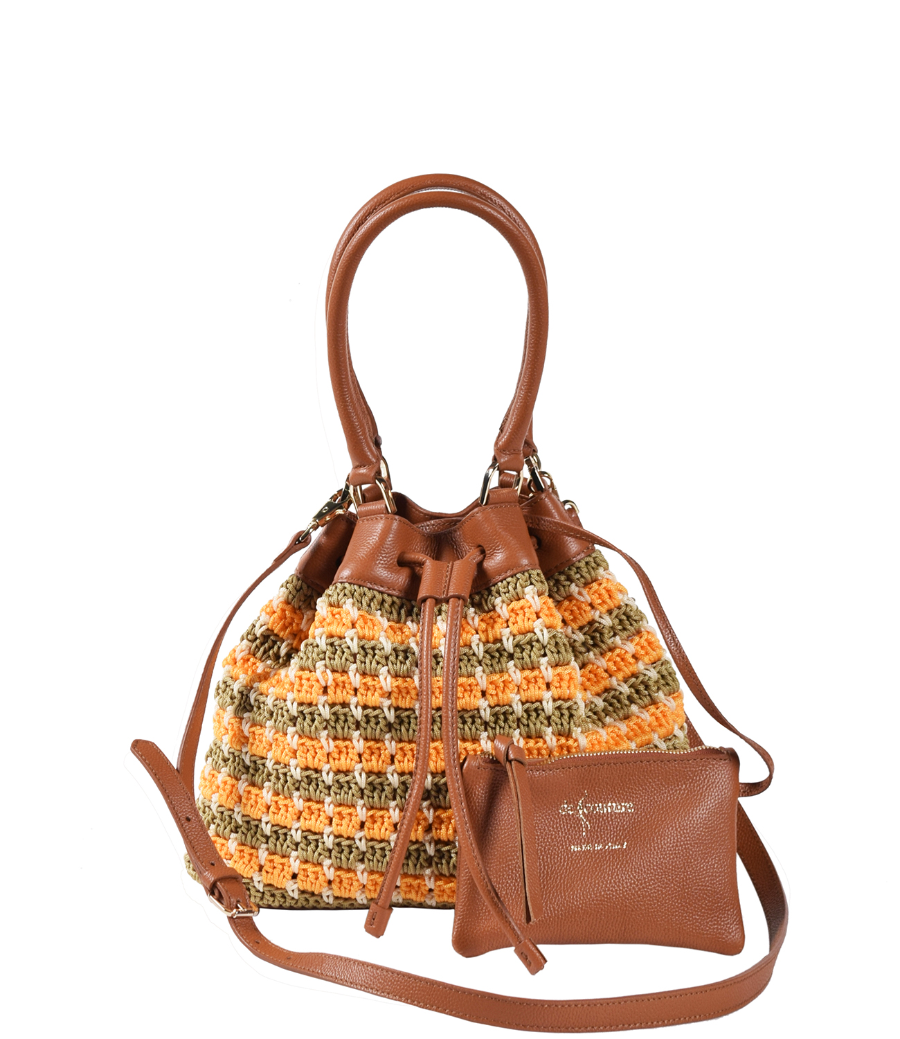HANDMADE IN ITALY — MICROGRAINED CALF LEATHER AND SUEDE — DRAWSTRING CLOSURE — DOUBLE HANDLES — BUCKET SHAPE