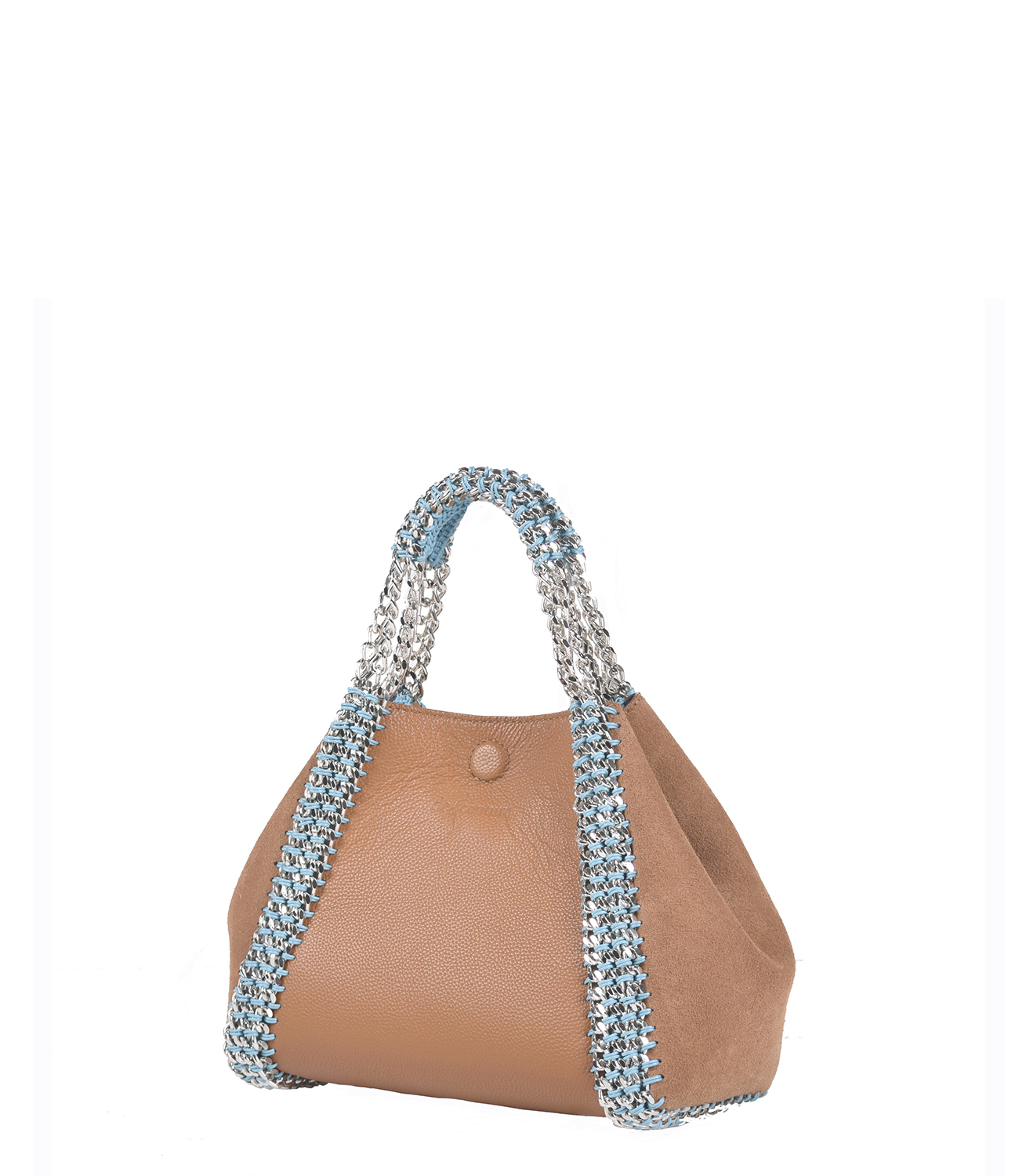 The structured micrograin body ensures durability and a modern finish, while the suede panels add softness and depth. Completed with signature woven chain handles, it is a distinctive piece that balances craftsmanship and contemporary style.